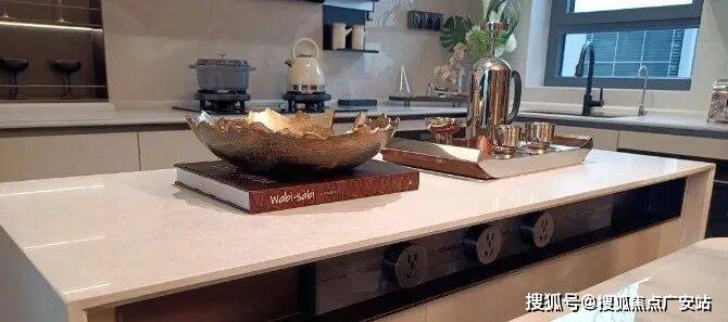 厨房额外标配带有收纳柜体的岛台空间,轨道式插座同样是交付标准,厨房台面是和内环某10万+项目同款材料: