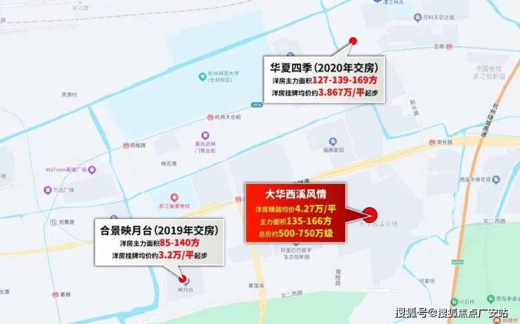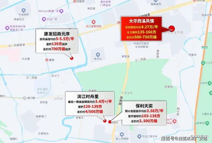 首先是新房:目前大华西溪风情周边还有3个可售项目,分别为刚刚官宣案名的建发招商元序,即将首开的保利天奕,以及最后一期尾房在售的滨江时舟里,分布如下: