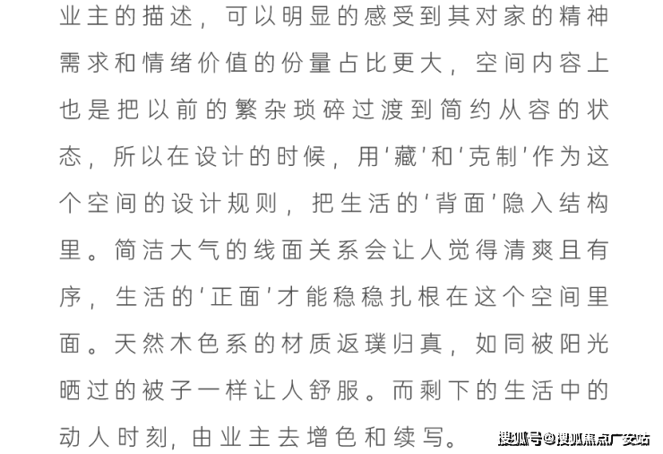 业主说:我现在就处于一个‘做减法’的人生阶段,孩子大了,家人的工作和生活也都稳定了,以前住的空间都是千家万户的大多数,现在就想改变一下,甚至是突破自己,希望给自己和家人一个全新的生活方式,如果非要我给出要求的话,我就希望我回家以后是可以赤脚走在家里,随意靠在墙边或者坐在家里的某个地方,我内心平静一点点,我的身体舒展一点点。