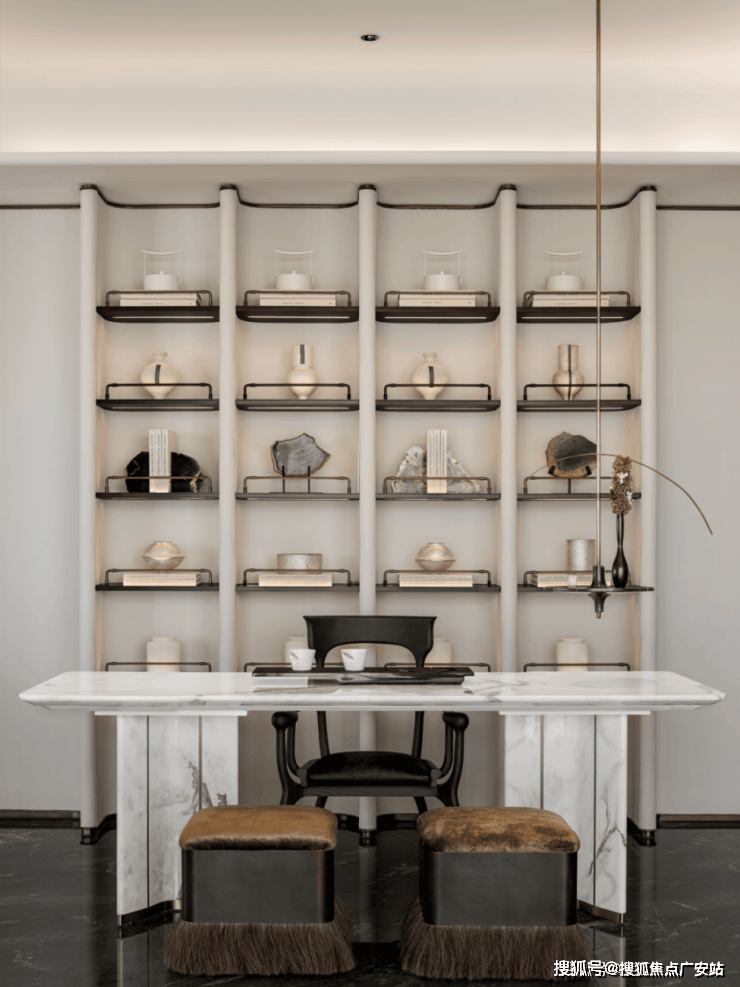 原方正客厅打通邻间与阳台,打造洄游式的空间,将电视墙连通客厅、书房与茶室;拆除玻璃隔断,扩大景观视野,日常收纳归入书房柜体,保持空间简约通透,如此一来,增添了更多不同生活场景的可能,加深生活的自在,减少生活的繁杂。