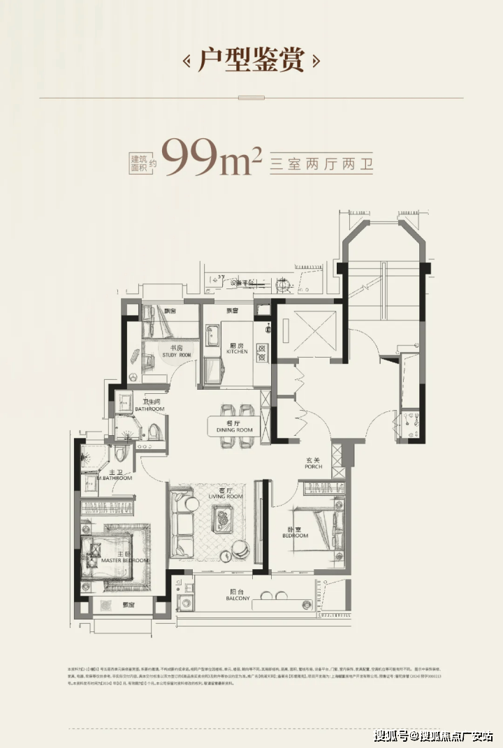 建面约99平米3-2-2飞机三开间朝南户型,动静分区,南北通透,南向面宽约9.5m,采光和通风条件十分优越!