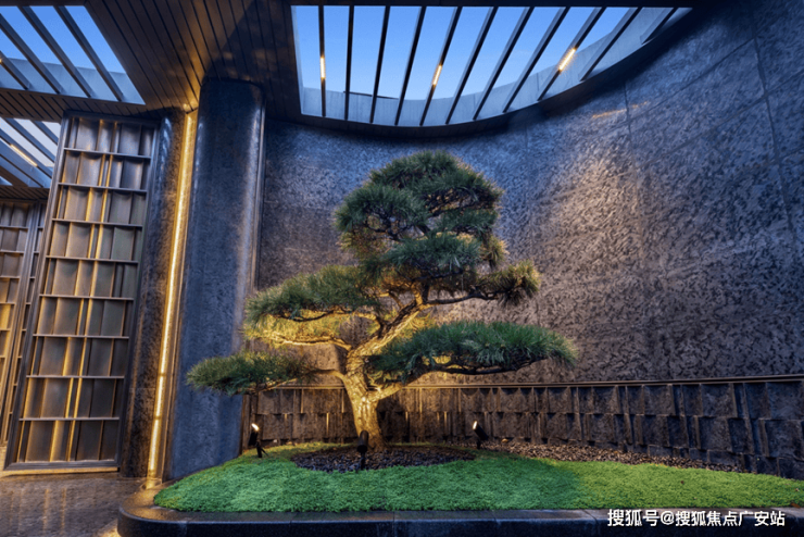 为了给业主一个完美的归家仪式感,项目设计了长约35m宽,约5.1m高奢阔门头,且有名贵黑松迎客。酒店式入户大堂的营造,精选雪山飞狐奢石,高山流水奢石、星白奢石等奢材。