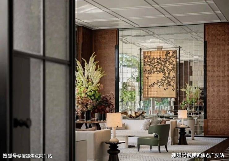 在生活馆里,你能看到发光石材的背景墙,瑰丽酒店同款壁灯、昂贵的黄虎眼奢石制作的接待台、同源瑰丽的风泥客石屏风、手工敲荔枝面……