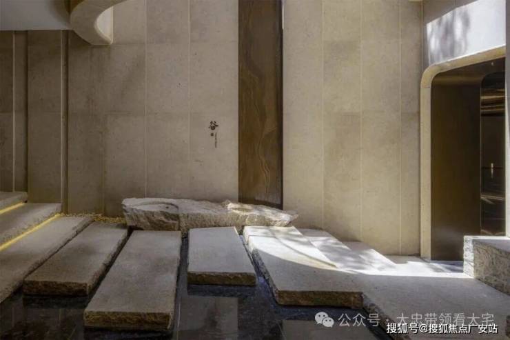 为了使我们在稀缺的地段营造稀缺的资源,把生活的想象现实化,越秀·外滩樾还在会所引“山水入园”。在空间有限的情况下,进行垂直空间的挖掘,营造了坡道景观、山水庭院和会所。