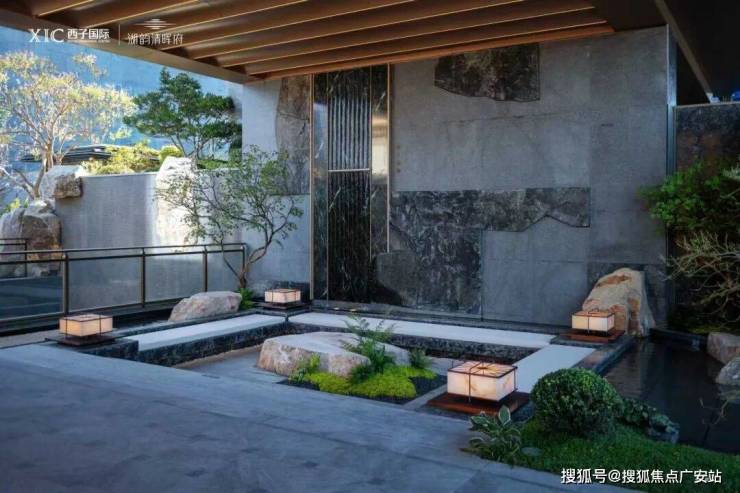 一般的大门都是直接连着入户大堂,但这里居然嵌入了一个方方正正的下沉式卡座,背后是流水潺潺,眼前有亭台游廊。
