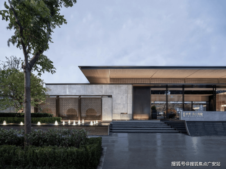 地上入户大堂方面,在造型上运用了中式元素挑檐,搭配香槟金型材金石嵌套设计,显示出一种精致奢华却内敛的感觉。
