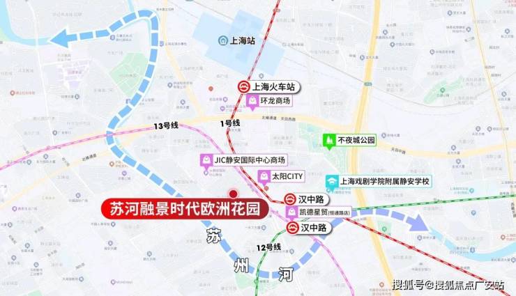苏河融景整个小区由汉中路、长安路、普济路与恒丰路围合,临近汉中路地铁站和苏州河滨河景观带。苏河融景整个小区分2期开发,其中1号2号一期开发,其余楼栋二期开发。