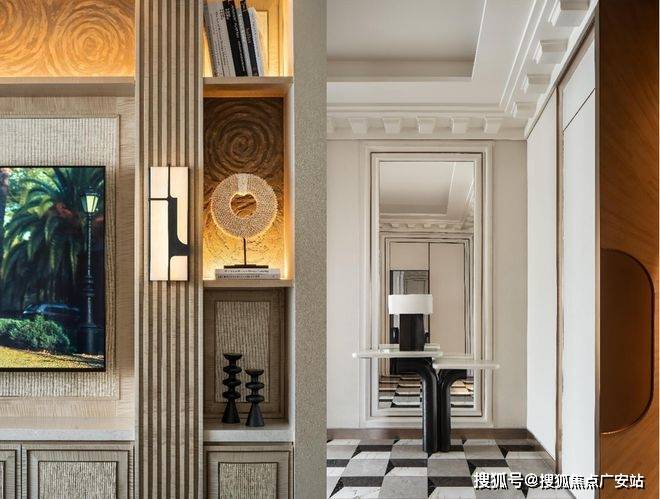 餐客厅尺度达到了惊人的16米,97m²,用一席壁炉做了视线分离,米色的洞石、自然冰裂纹的艺术漆。背景墙拱形胡桃木的静谧,地板拼花木格纹的精细,沙发钢琴键织布的韵律,营造的是回归生活本质的轻松写意。