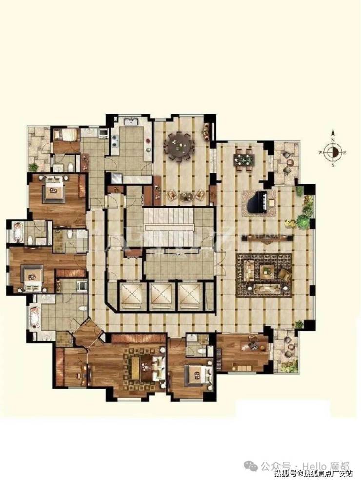 总格局:东向是100平客厅-南北各带1外露阳台,客厅南向连接开放式书房,其中次卧套间+主卧大套间南向采光,西向有两个次卧套间,北向是餐厅、厨房和保姆套房
