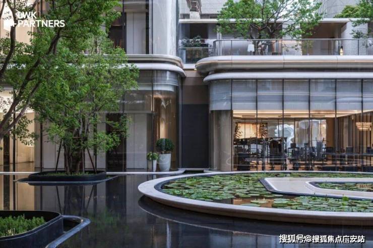 穿过大堂,2,000㎡ 四季立体会所通过巨幅落地玻璃延展景观视野,目之所及尤其静雅。漂浮的半圆形城市会客厅锚定了整个浮岛水院的中心,纤细不锈钢格栅勾勒了悬浮体量的造型,形成了一种戏剧性的表达。