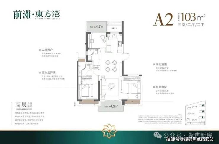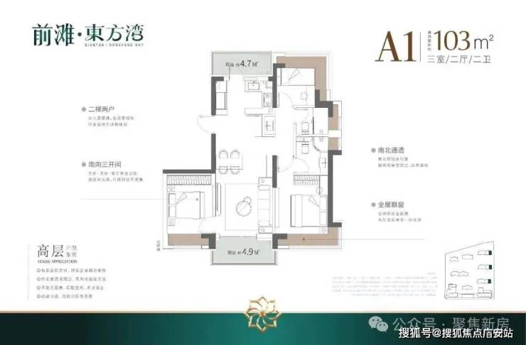 建面103㎡3房2厅2卫,户型三开间朝南、室内“5个飘窗+2阳台”,不管是采光、视野、通风、私密性,还是实用性都十分出色.