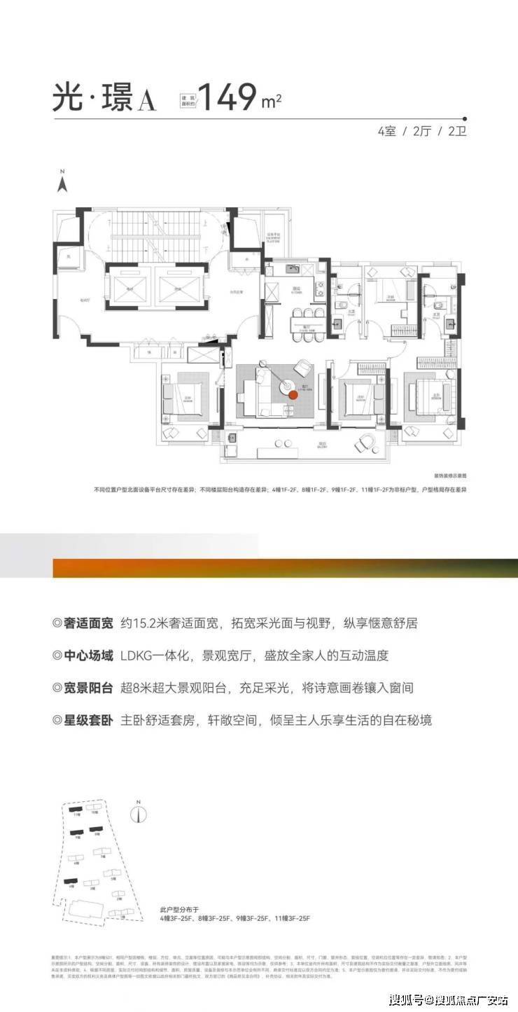 - 建面约149㎡四居**(分布于8#、11#、9#):2梯2户,总高25F,四开间朝南,南向面宽约15.2米,搭配8.4米双联阳台,LDKB一体化设计,空间通透开阔,主卧套房带独立卫浴,兼顾功能性与舒适性,公示价475-520万/套,满足改善家庭需求。