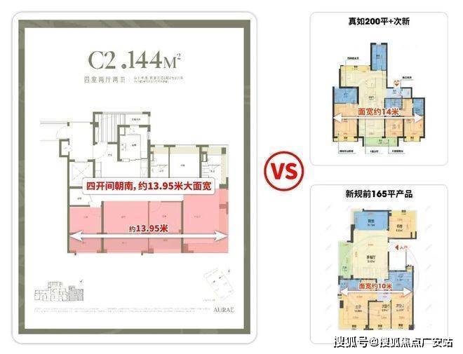同面积段新规产品普遍仅三开间朝南、面宽约11米,本项目直接做到四开间朝南,面宽高达约13.4米。面宽属于后期无法改变的硬指标,带来的是更持久、更舒适的采光与视野升级。