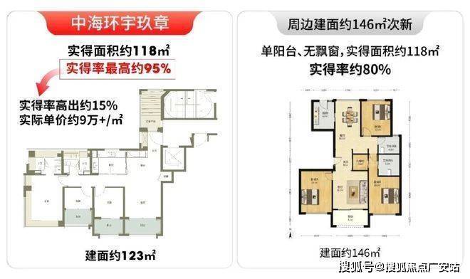 项目约123㎡户型,实得率最高约95%,而周边非新规 / 二手房实得率普遍只有约80%。