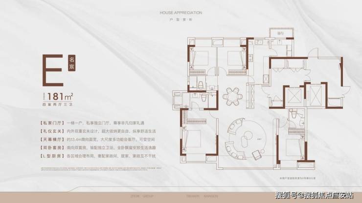 主力户型:129-181㎡四室/五室,一梯一户设计,得房率77%-81%