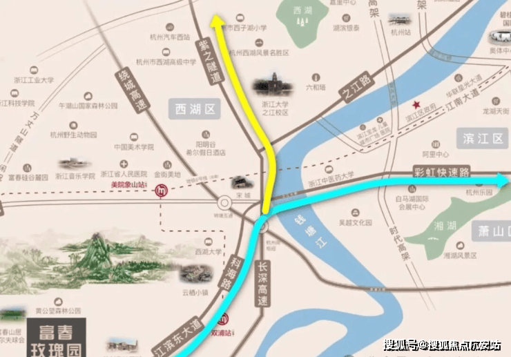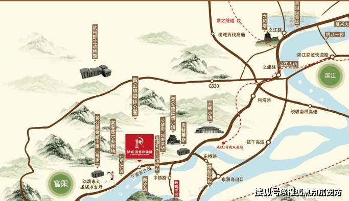 富春玫瑰园售楼处地址位置:富阳区东洲街道江滨东大道 515 号(黄公望森林公园南麓,富春江畔)