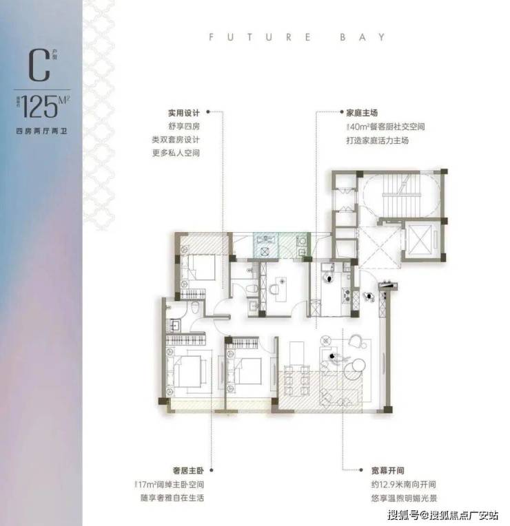 约139方户型, 4.5开间朝南+储藏间,南向15.9米超大采光面,做到五开间朝南的空间,标配储藏间,三个南向卧室设计。