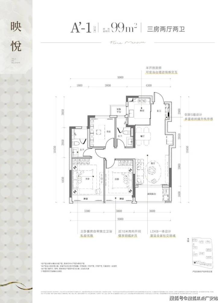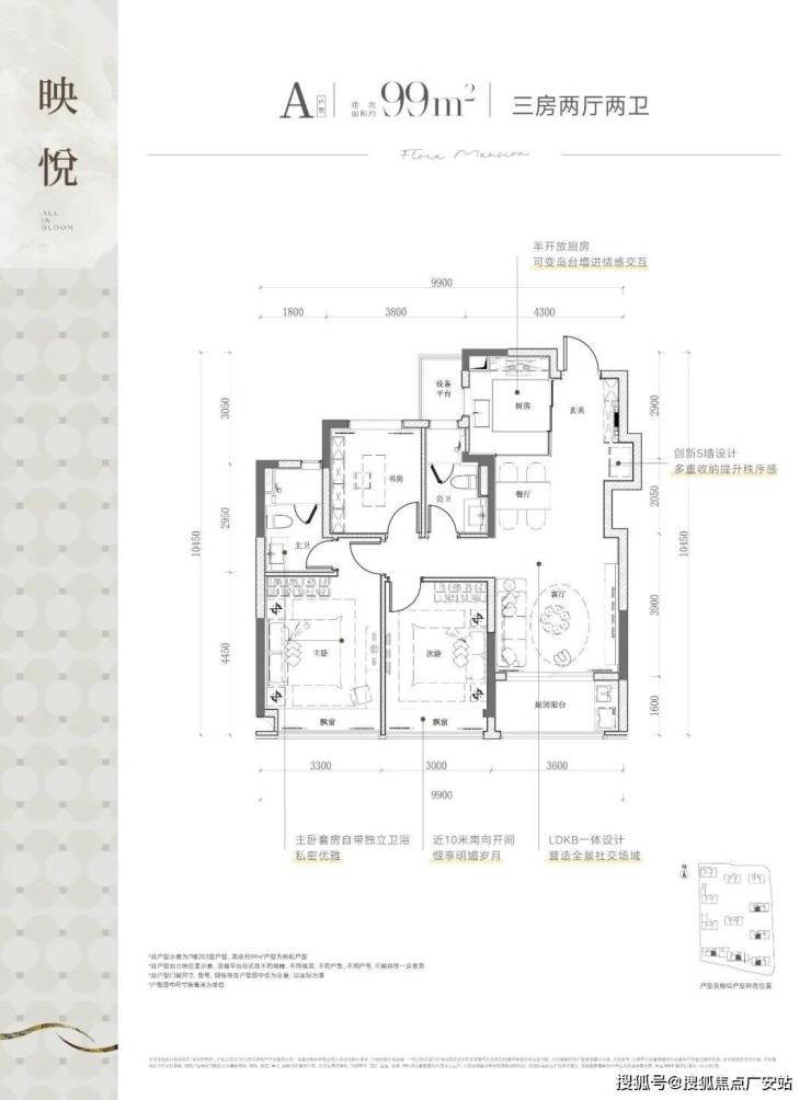 该边套户型,不仅有270度的采光视野,主/次/客卧三大开间并立朝南,“含阳光量”十足。