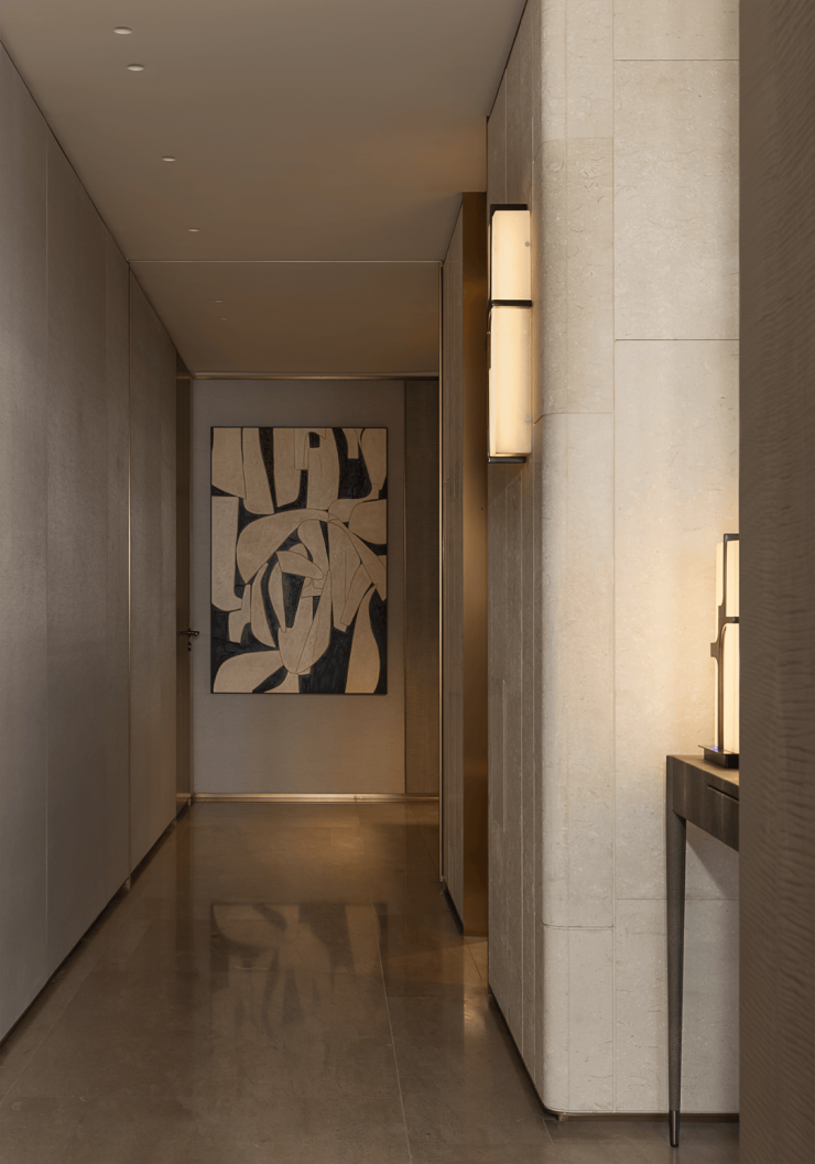 主卧采用留白设计,保留部分家具,摒弃繁复装饰与色彩堆砌,以形体美、轻重色和谐及精准功能布局满足家庭需求。洞石纹板与原生木色搭配,低饱和色调奠定幽远宁静基调。简练线条与天然材质纹理交织,褪去冗余,在素净空间中营造出温润的时光质感。