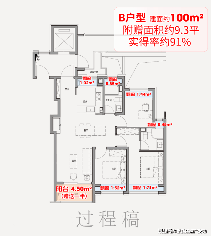 该户型满配6飘窗,比常规户型多2个卫生间飘窗、1个厨房飘窗;再加上阳台送一半面积,经过测算总赠送约9.3平,相当于一间次卧。