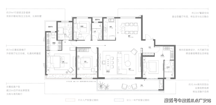 整个南向面宽达到了约20米、“跑道式”双阳台宽度约10.4米、约7米面宽的大横厅、行政级主卧套房面积近约39㎡、餐厨空间面积达到了约22㎡……几乎每一个数据都相当令人震惊,每一个居住的空间拥有舒适的大屏视野!