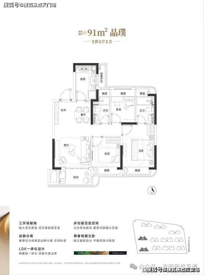 建面约91㎡做3房2卫,三开间朝南、3房5飘窗1阳台,整体室内的采光、视野以及通风都相当出彩。动静分离+主卧套房的设计,保证了整体居住的安静和私密性。