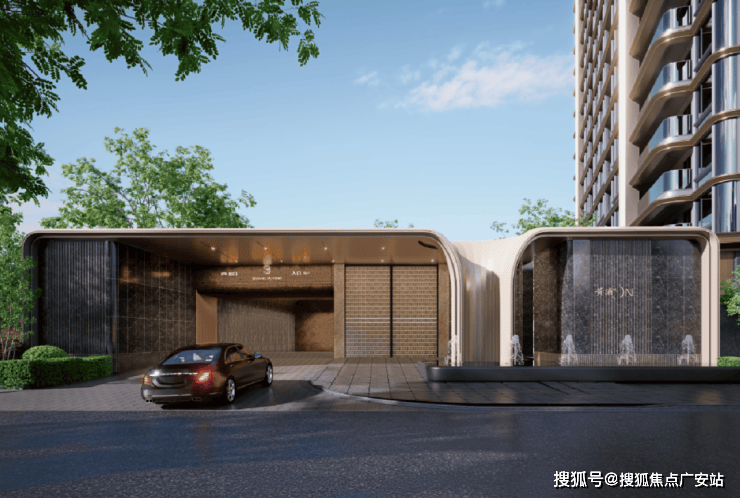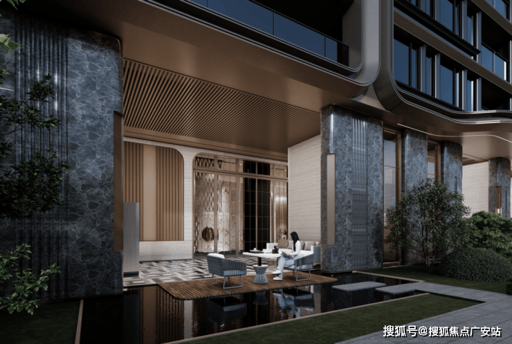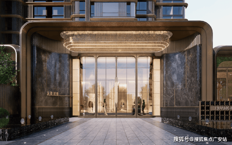 运用深色石材、仿古铜弧形铝板与大面超白玻璃,