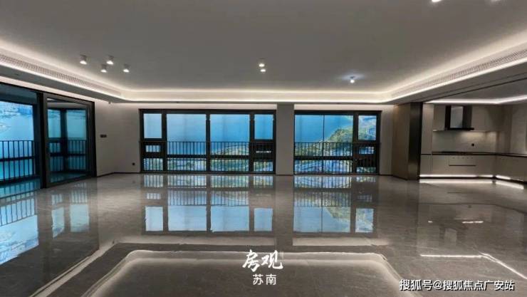 超百平的超级大客厅,简一地砖通铺,顶部悬浮吊顶,墙布交付。南向大阳台+西向大面积玻璃,270°景观面,用来欣赏独墅湖美景。