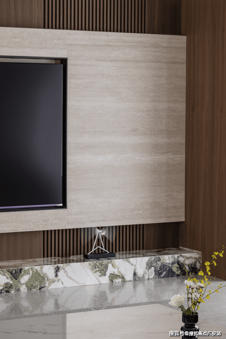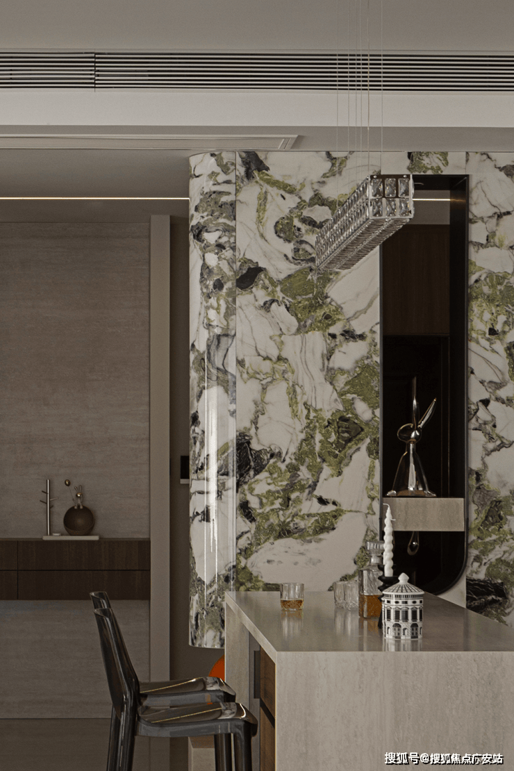 入户玄关,应用了翡翠绿岩板热弯工艺,低奢材质的选择,打造时尚优雅的宜居之境,使空间散发浪漫气息,成为空间的点睛之笔。