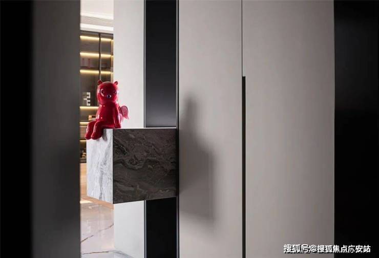该户型没有入户的玄关空间,进门便是正对着餐桌,为了缓解这个布局上的缺憾,设计师将门厅的鞋帽柜进行体块化穿插设计,利用凸出体块形成悬空的端景,视觉上界定入户的第一个视觉焦点,而这里摆放了艺术家张占占的PUPU熊,红色的小熊十分治愈,让归家的人看到它会忘掉疲惫和烦恼。