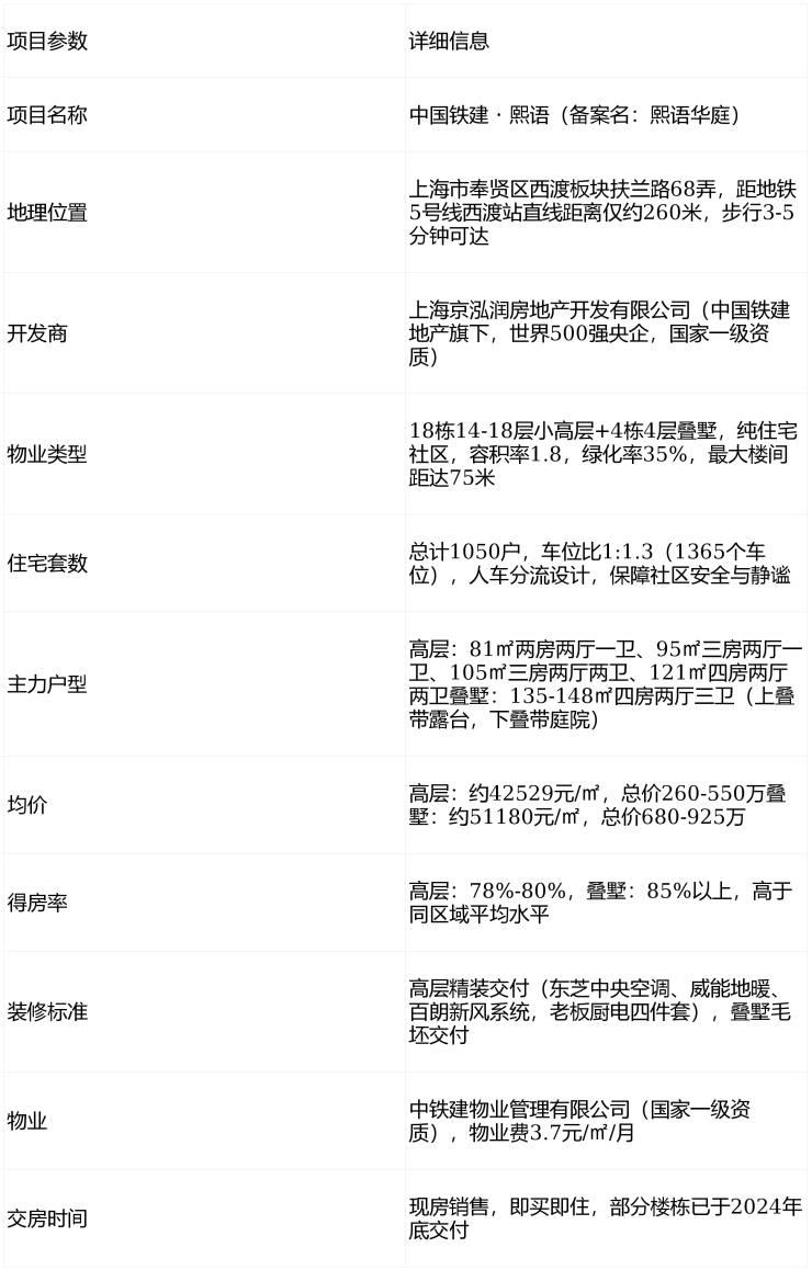 中国铁建・熙语是奉贤西渡板块极具竞争力的地铁口现房项目,核心价值在于央企品质+地铁零距离+现房零风险+低密社区+全周期户型的组合优势,适合预算260-925万、追求交通便捷与居住品质、首次置业或刚需改善的年轻家庭,尤其适合在闵行、奉贤工作生活的客户。