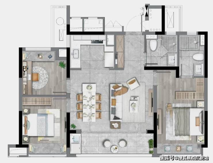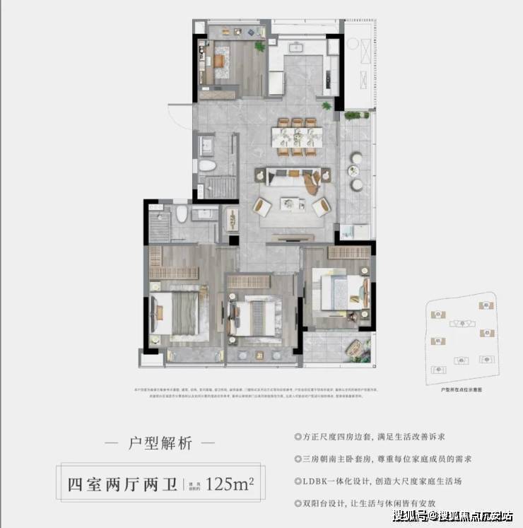 125㎡四房两卫同样是边套:三个卧室均排列在南侧,充分实现了“阳光平权”,每个家庭都可以沐浴在阳光中醒来。LDBK一体化的公区,充分实现了家庭成员间的互动;除了边厅外接的阳台外,南向次卧同样设计了阳台,兼顾了景观和晾晒的需求。