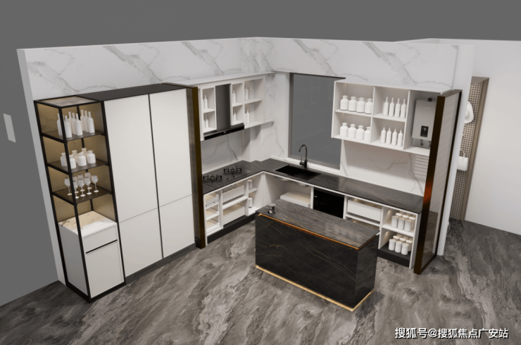 看到约143平户型,厨房岛台和上柜都不稀奇,厨房外的半开放式餐边柜和利勃海尔内嵌式同样也作为交付标准附赠,柜体额外提供接近1立方面积的收纳空间: