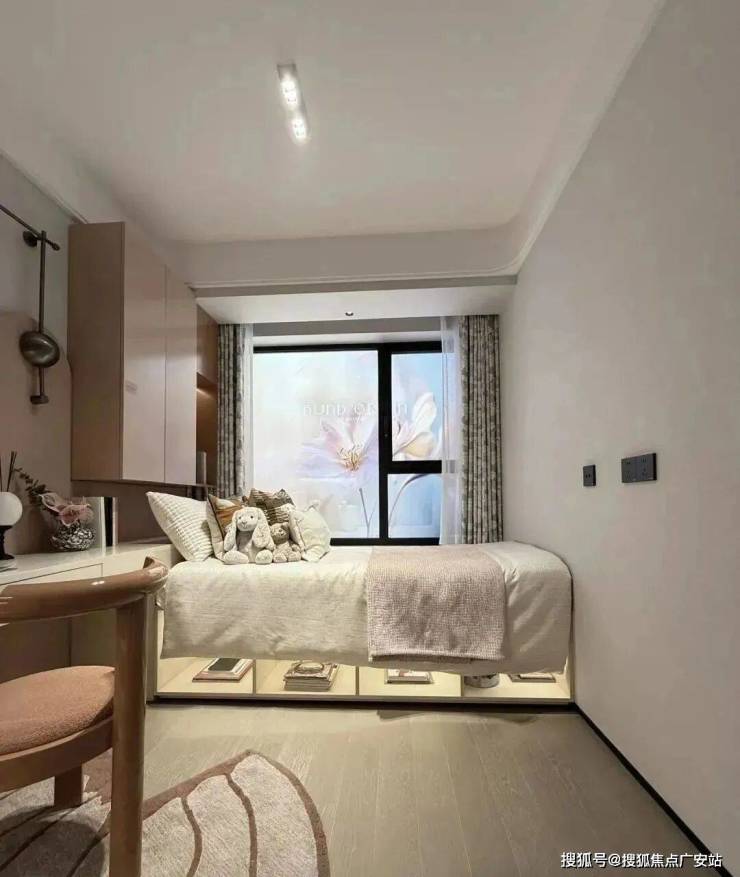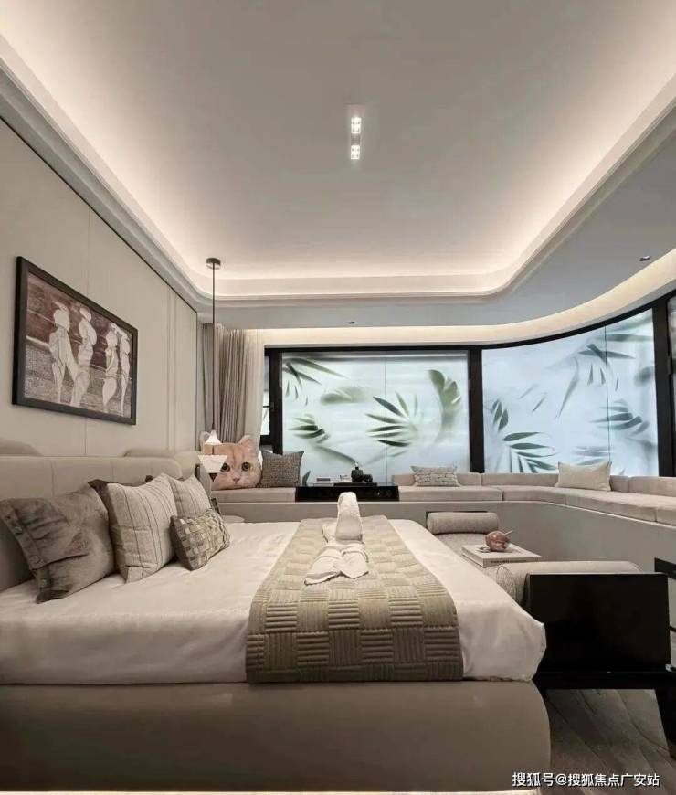 主卧和约99平户型一样,衣柜更大形成衣帽空间,还交付有半开放式、类似于酒店的迷你吧设计: