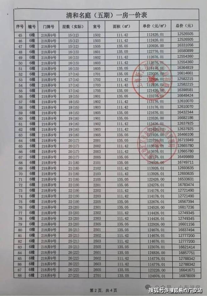 最新一房一价表公示: