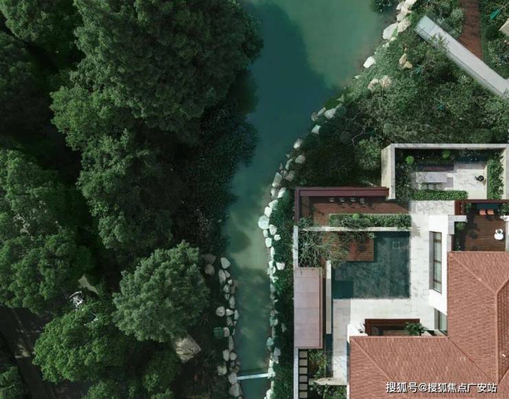 万科·公望整个地块峰峦叠嶂,上百年的古树随处可见,又因着地块有着上百米的天然高差,以致溪流经年不断,就着溪涧,涓涓潺潺,一种王维式的禅意山水跃然纸上。至于屋舍,藏于茂密植被的缝隙间,隐约可见。