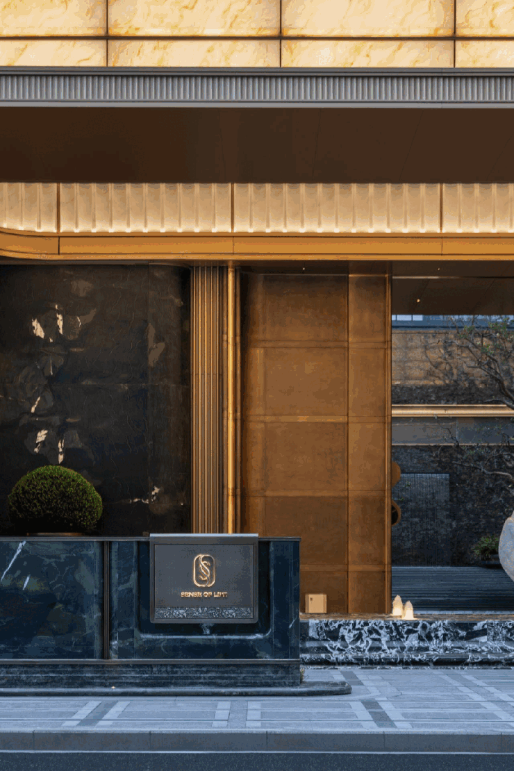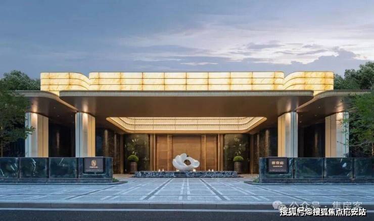 如山茶花般的定制石雕,映衬厚重的朱氏铜门,配上两侧大面荷塘月色奢石、铂金钻石材景墙,远远望去,宛如歌剧开幕时垂坠的天鹅绒帷幔,打开归家的仪式感。