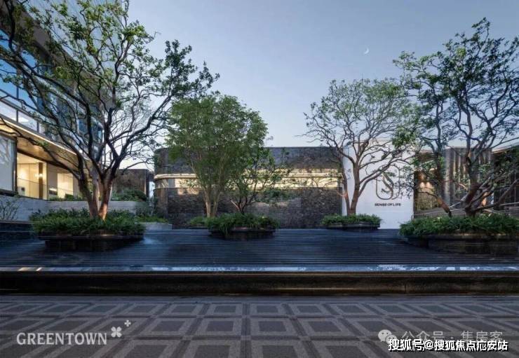 穿过小区大门后,眼前呈现一派绚烂水景,视野豁然开朗:五株婀娜香橼树在花坛中随风轻摆;叠层水幕沿着碧潭金沙、蓝眼睛花岗岩台阶潺潺流淌,营造出宁静祥和的归家心境。