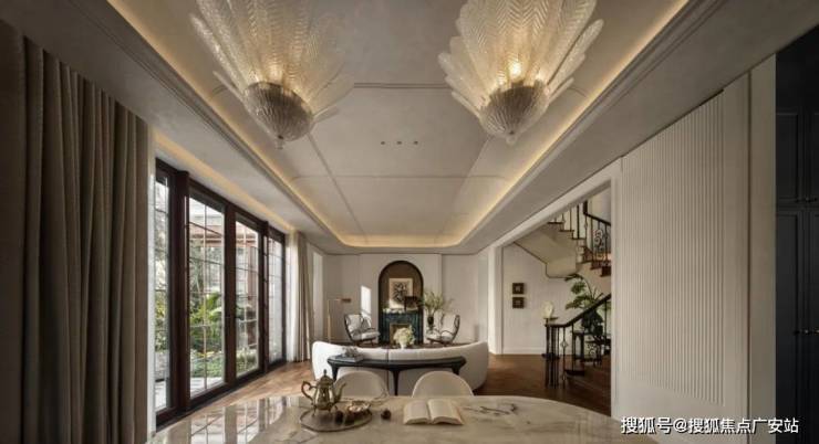 利用本身超大面宽属性,做出非常大的落地窗,这些窗又用很多传统的线条将它进行分割装饰,连续方格长窗,既保障了室内通透采光,又还原了花园别墅的线条美感与风情。