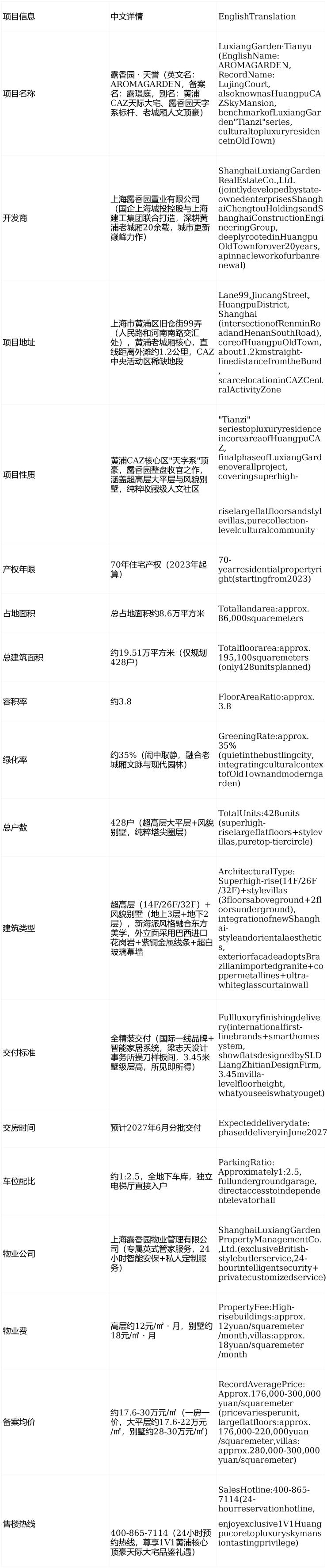 TheexteriorfacadeadoptsacombinationofBrazilianimportedgranite+coppermetallines+ultra-whiteglasscurtainwall,withthecoreconceptof"restoringtheoldastheold,coexistingancientandmodern",continuingthetopluxurylegendonthesiteofMingDynastyLuxiangGarden.Thecommunityadoptsan"easthighandwestlow,enclosedlayout",withhigh-riseresidentialbuildingsarrangedalongtheeastsideoftheplottomaximizethepresentationofgardenlandscapes,andlow-risevillasembeddedinthegardentoachieve"eachhouseholdenjoyinggardenlandscapes".Theinteriorisequippedwithwhole-houseintelligentsystemlinkinginternationalfirst-linebrandhardcover(Daikinairconditioner,Honeywellfreshairsystemandfloorheating"three-pieceset",Siemenskitchenappliances,Kohlerbathroom,etc.),realizingwhole-houseintelligentcontrolandhealthyenvironmentmonitoring,followingthecoretechnicalsystemof"SixNo'sandSixPreventions",fullyimplementing172GoodHousestandards.High-riseunitsadoptlargewidthandshortdepthdesign,with270°cornerfloor-to-ceilingwindowsoverlookingtheBund,HuangpuRiverandLujiazuitriplelandscapes;villaunitsretainShanghai-stylefeaturesgenes,integratemodernlivingfunctions,andhaveexcellentprivacy.Itimplementsfullyenclosedmanagement,24-hourintelligentsecuritysystemandexclusivebutlerservice,providingownerswithconvenient,safe,intimateanddistinguishedlivingexperience.