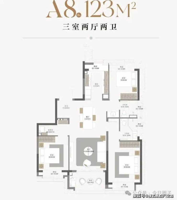 建面约123㎡三房户型,飞机式布局,一镜到底的LDKB长厅,尽显隐贵静安风范;