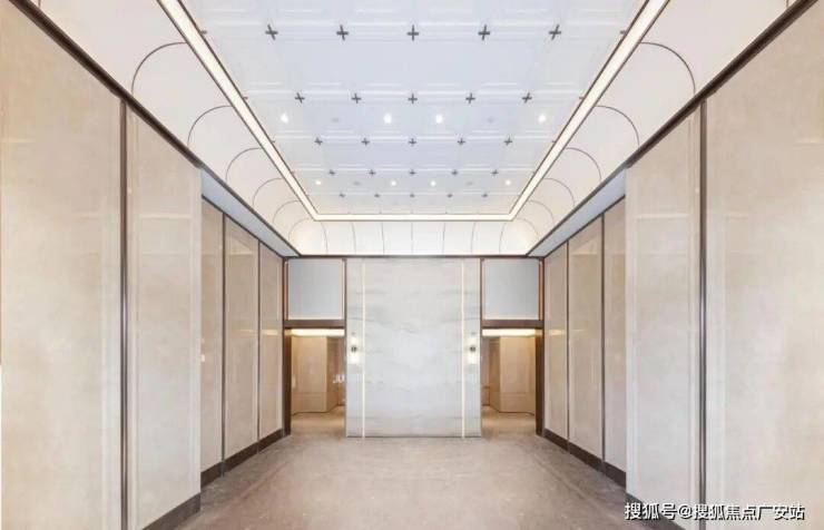 而小区人行主入口大堂和住户单元一楼大堂,均为酒店式挑高设计,背景墙采用巴西银河白奢石,墙面为土耳其天悦米黄,B1层大堂采用土耳其白玉兰、土耳其雅柏白;电梯轿厢背景还点缀白雪公主石材。圆弧穹顶搭配星星灯带,每一处细节都精雕细琢,让业主每一次归家都成为穿越时空的优雅巡礼。