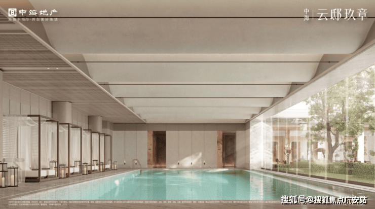 最后来看泳池。云邸玖章做了再升级。改为采用大尺度的落地玻璃拼接,约2.4米宽巨幅玻璃,且通过精致的玻璃交接细节处理增进室内外空间的融合,强调泳池的无界感,真正实现了无边泳池的效果、质的飞跃。