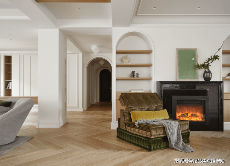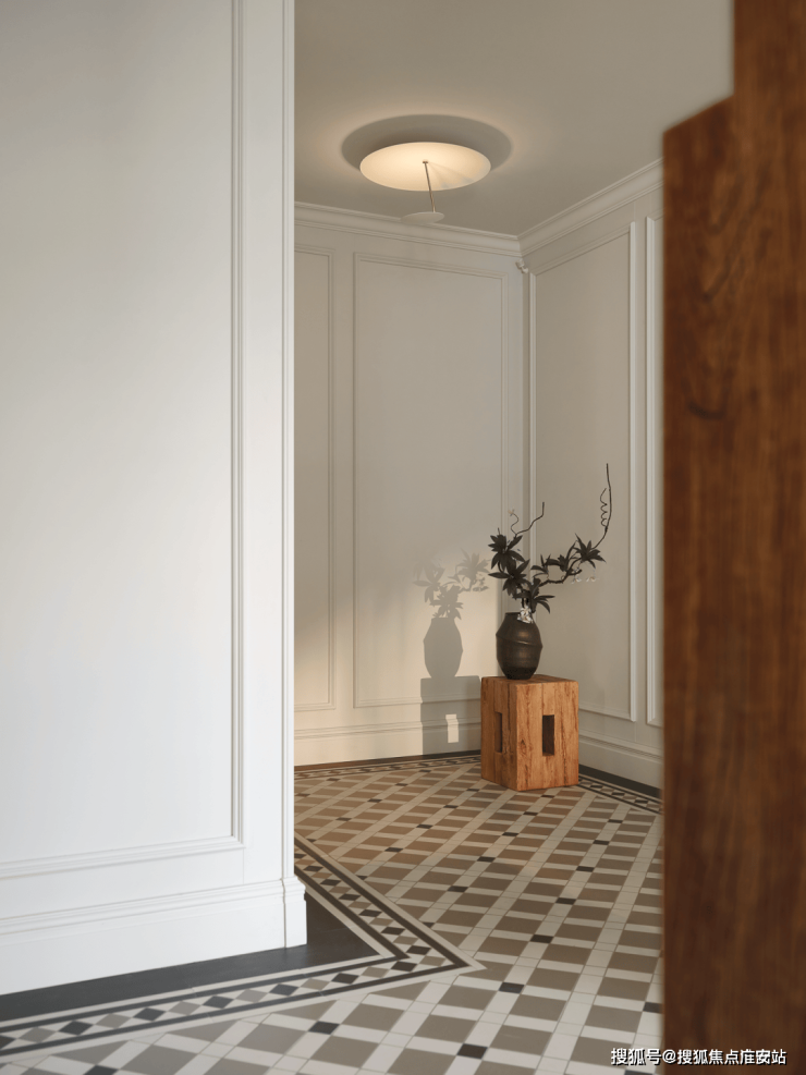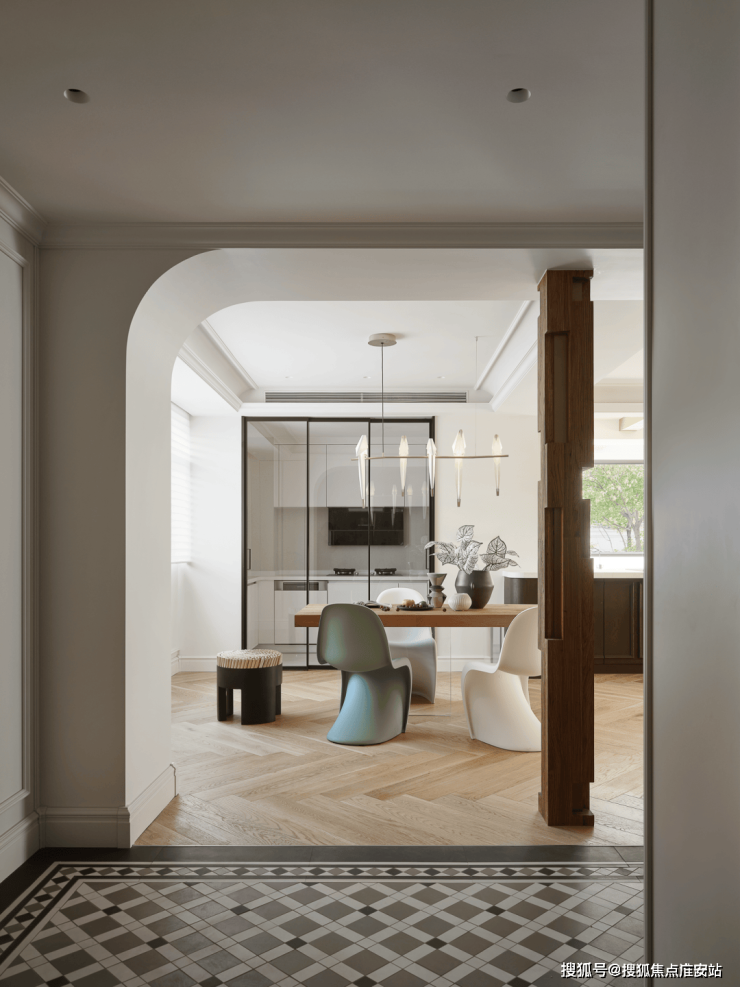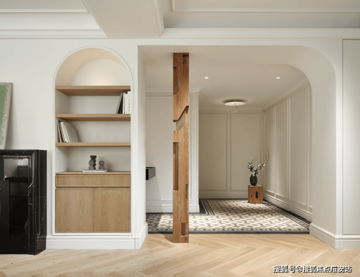 在布局规划上,设计师根据两人居住的基本需求,缩小了家政区域的面积,释放出多余的空间,原来的保姆间被改造成玄关区;原有的两个入口,关闭了一个,另一个则升级为主入口,并在新主入口处增设了一个具有复古风格的入户玄关,进一步优化了空间布局和整体美感。