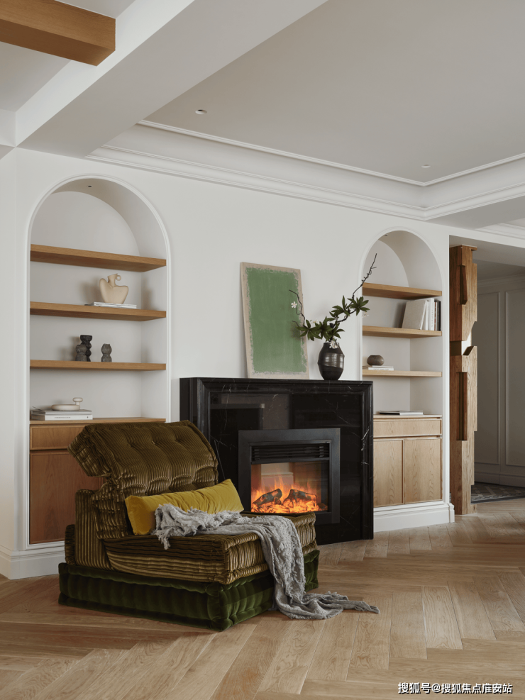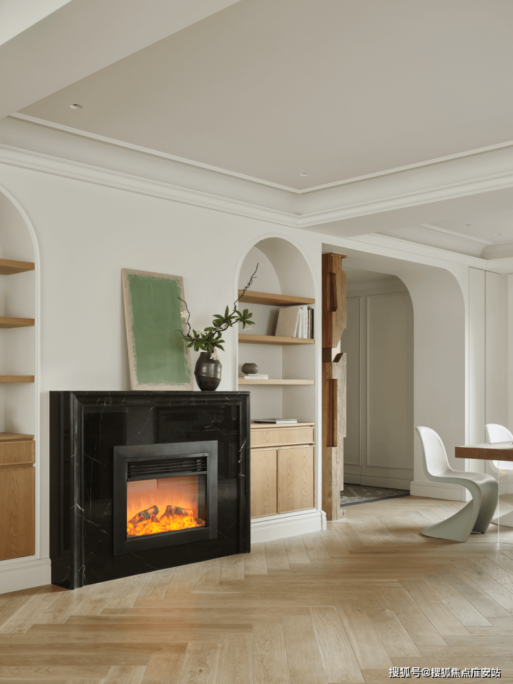 原餐厅部分区域改成了惬意舒适带有壁炉的休闲展示区,在这个角落,主人可以展示他们钟爱的手办和书籍。