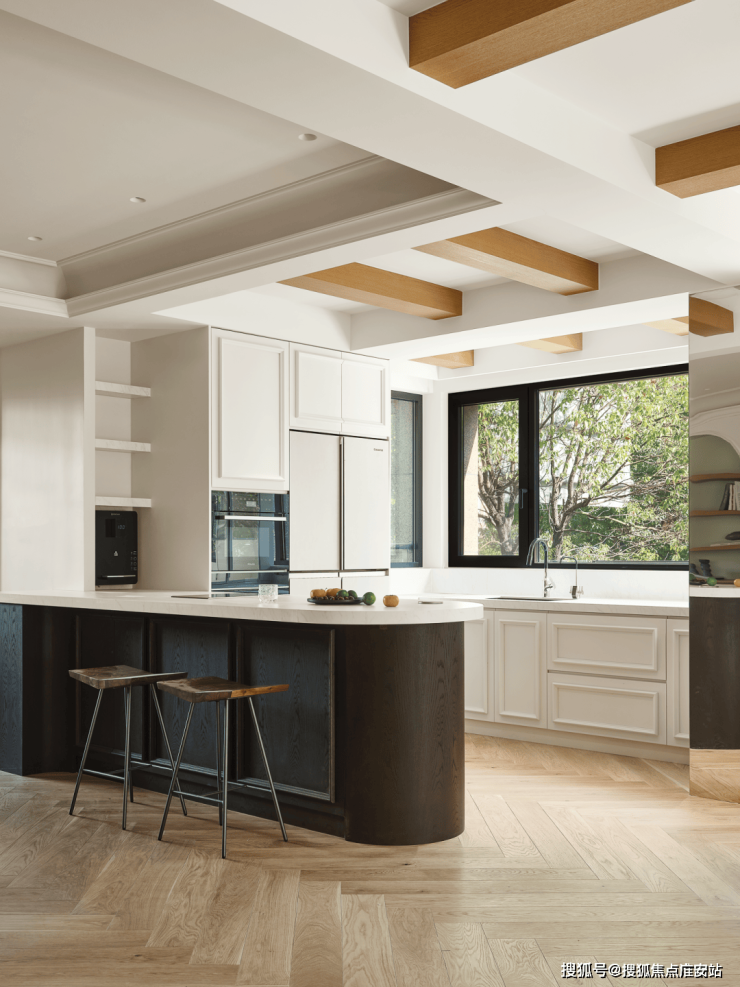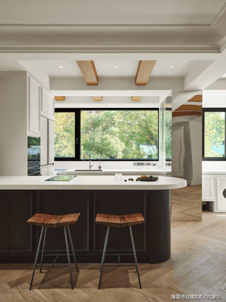 西厨区不仅具备收纳功能,还可容纳洗碗机、冰箱、烤箱和咖啡机等电器,方便主人备餐。三米长的岛台连接公共区域,兼具烹饪与社交功能。当主人在备餐时,可以与客厅或书房中的伴侣互动,使烹饪不再孤单,而成为一场随时上演的浪漫约会。