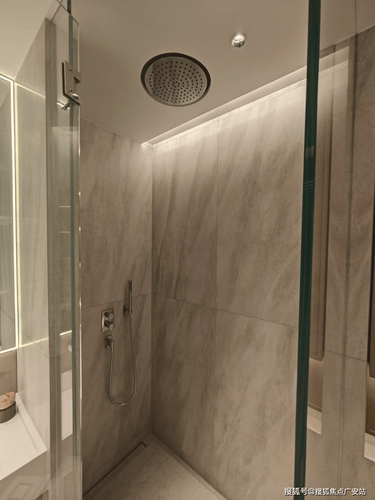 卫生间的顶喷也是预埋了水路和吊顶,都要严丝合缝匹配,安装成本是普通的淋浴房的5倍左右。