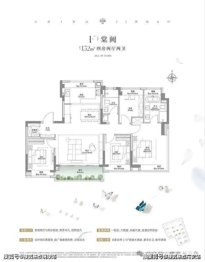 建面约117㎡3房2厅2卫,做到了3+1开间朝南5个飘窗+主卧套房设计+270°转角飘窗,所有的尺度都有进一步提升。