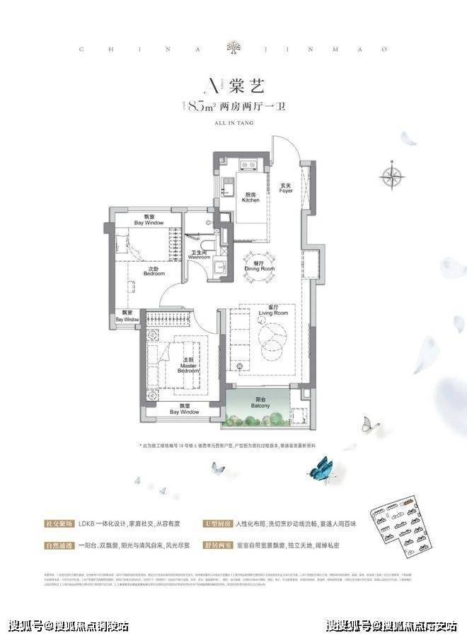 建面约85㎡2房2厅1卫,做到了双开间朝南+3个飘窗+LDKB一体化设计,附加空间非常多。