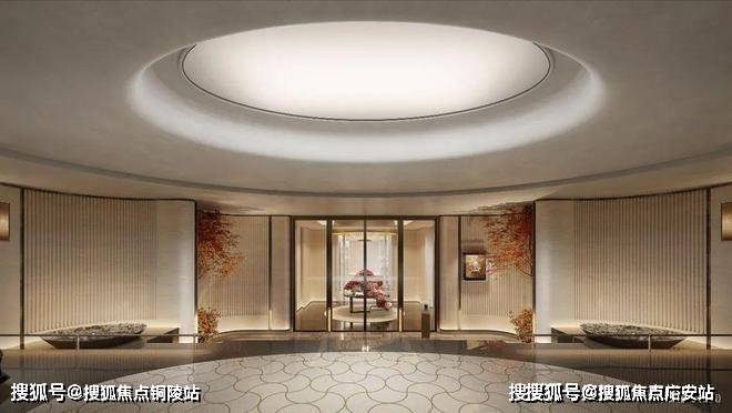 约32米气派门厅,入口采用三重弧形石材墙体+圆角幻彩穿孔顶,四重酒店式归家厅堂,让每一次归家都充满仪式感。
